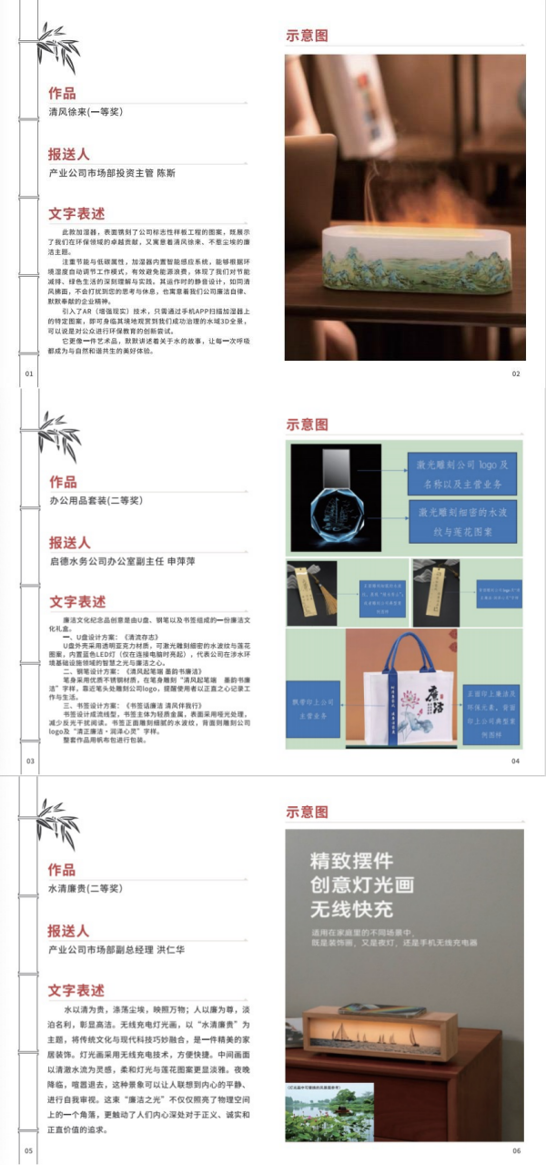 本次活動(dòng)以“清風(fēng)廉韻 匠心傳承”為主題,通過全員參與、寓教于創(chuàng)的形式,深度挖掘廉潔文化創(chuàng)意內(nèi)涵,可謂是一場精彩絕倫的思想碰撞。投稿作品涵蓋了辦公用品、文創(chuàng)擺件、數(shù)字產(chǎn)品、生活家居等多個(gè)領(lǐng)域,融匯了蓮花、翠竹、清泉、水晶、茶葉等多種廉潔文化符號(hào),彰顯了廉潔主題和公司主責(zé)主業(yè),廉潔創(chuàng)意與實(shí)物載體相結(jié)合,具有較好的使用價(jià)值和警示教育意義。其中一等獎(jiǎng)作品《清風(fēng)徐來》創(chuàng)意,以加濕器為載體,通過巧妙的構(gòu)思融入廉潔元素和公司主業(yè),既傳達(dá)了節(jié)能低碳的環(huán)保理念,又運(yùn)用AR技術(shù)和內(nèi)置感應(yīng)系統(tǒng),展示產(chǎn)業(yè)公司在涉水環(huán)保領(lǐng)域所做出的卓越貢獻(xiàn),向使用者生動(dòng)講述了關(guān)于水和廉潔的故事,也讓每一次呼吸都成為人與自然和諧共生的美好體驗(yàn)。