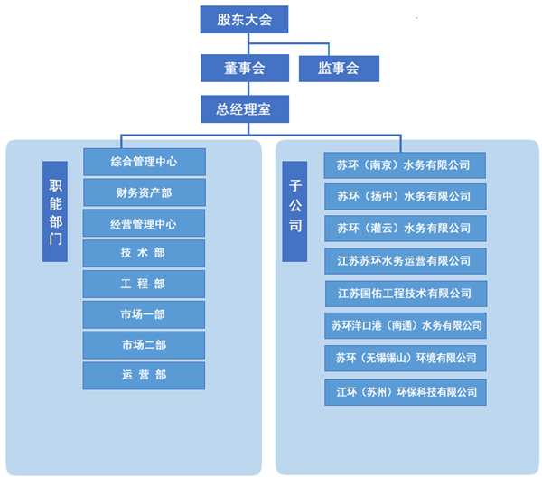 根據職能劃分,環保產業公司設置八個生產經營及職能管理部門:綜合管理中心、財務資產部、經營管理中心、市場一部、市場二部、技術部、工程部、運營部;下轄二個全資子公司、六個項目公司:江蘇國佑工程技術有限公司、江蘇蘇環水務運營有限公司,蘇環(南京)水務有限公司、蘇環(揚中)水務有限公司、蘇環(灌云)水務有限公司、蘇環洋口港(南通)水務有限公司、蘇環(無錫錫山)環境有限公司、江環(蘇州)環保科技有限公司。