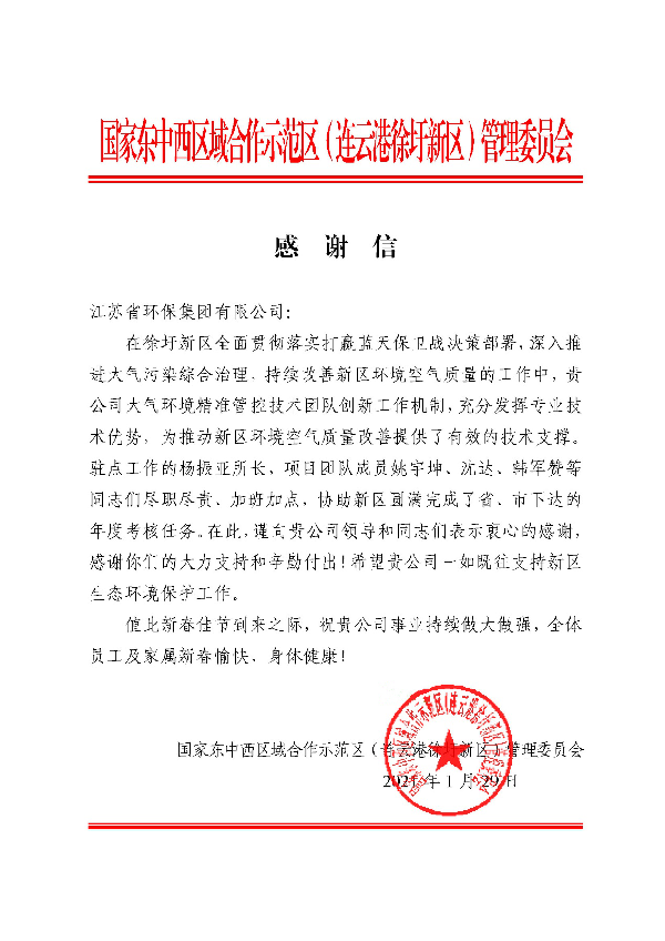 2020年,徐圩新區空氣質量和改善幅度在全市均排名第二,成為了連云港市PM2.5平均濃度率先達到環境空氣質量二級標準的區域之一,實現了歷史性突破,環境工程技術公司也獲得了徐圩新區管委會的高度贊揚和肯定。
